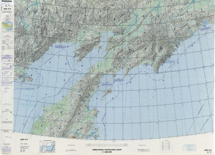 | Keywords: Operational Navigation chart D-9, 5th edition.jpg  en 1 1 000 000 scale Operational Navigation Chart Sheet D-9 5th edition Covers the U S S R Lambert Conformal Conic Projection txu-pclmaps-oclc-8322829_d_9 jpg onc/ Defense Mapping Agency Aerospace Center St Louis Air Force Station Mo 1983-01 Covers 56N to 63N 154E to 176E ONCs uploaded by Revent Operational Navigation Chart Old maps of USSR Maps of the Sea of Okhotsk Maps of the Bering Sea Maps of Kamchatka Maps with Lambert conformal conic projection JPG maps Operational Navigation Charts in the Perry-CastaƱeda Library PD-USGov  |
