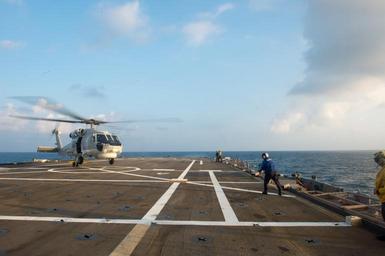 | Keywords: Operations aboard USS Denver support Cobra Gold 140213-N-IC565-560.jpg en The Royal Thai Navy lands a MH-60S Knighthawk helicopter on the flight deck of Austin-class amphibious transport dock ship USS Denver LPD 9 Denver is participating in exercise Cobra Gold 2014 CG 14 CG 14 is a multinational exercise conducted annually to promote interoperability and training between participating nations U S Navy photo by Mass Communication Specialist 3rd Class Bradley J Gee/Released 2014-02-13 Petty Officer 3rd Class Bradley Gee https //www dvidshub net/image/1168321 140213-N-IC565-560 2014-02-15 04 09 SOUTH CHINA SEA TH PD-USGov-Military-Navy MH-60S Seahawk USS Denver LPD-9 Images from DoD uploaded by Fæ |