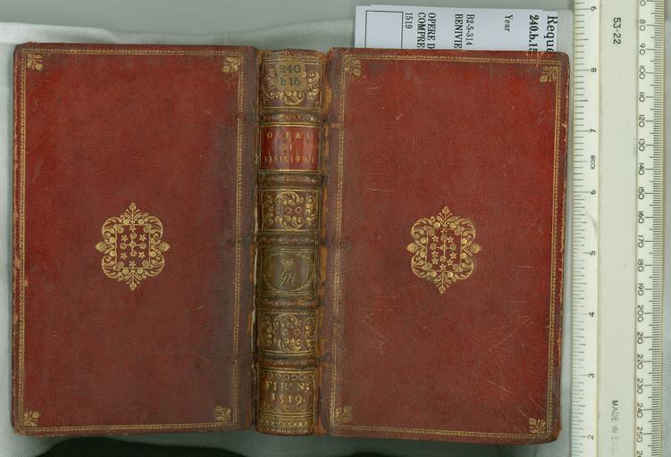 Keywords: Opere di Hierony. Benivieni - Upper and lower cover and spine (240b15).jpg Style Centrepiece made of small tools Acorn; Caption Upper and lower cover and spine; Colour Red; Edge Gilt exhibition history Decorative Technique Tooled in gold; Cover Material Goatskin includes morocco turkey etc Paste paper endleaves Probably from the Venetian workshop associated with Joseph Smith Crowned initials of King George III added to spine which has been tooled and lettered in gold object history Text 1519; Unspecified; George III King of Great Britain 1760-1820 object type Cc-zero place of creation Binding Italy place of discovery Unspecified British Library image http //www bl uk/catalogues/bookbindings/LargeImage aspx RecordId 020-000017217 ImageId ImageId 56223 Copyright BL Opere di Hierony Benivieni Uploaded with GWToolset Opere di Hierony Benivieni - Upper and lower cover and spine 240b15 http //www webarchive org uk/bldatasets/bindings/240B15 jpg Bookbinding 18th-century bookbinding British Library Bookbindings |