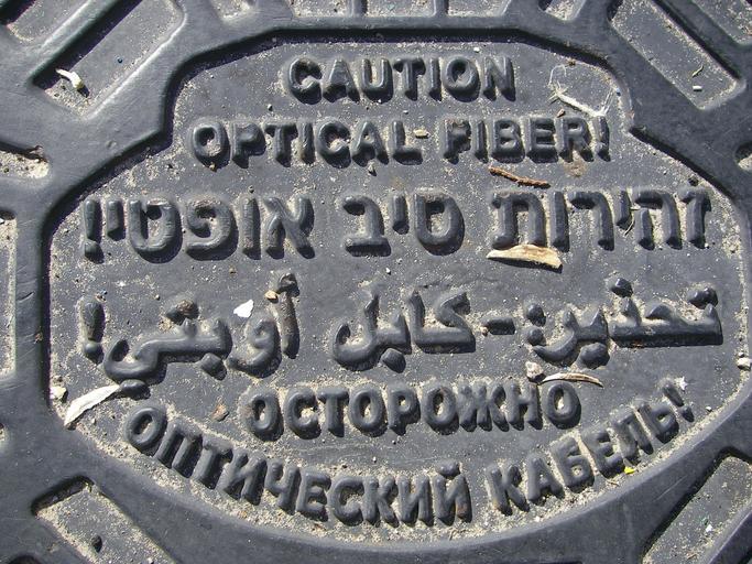 | Keywords: Optical cable manhole cover in English, Hebrew, Arabic and Russian in Tel Aviv, Israel.jpg en The manhole cover in Tel Aviv Israel with the warning 'Caution optical fiber cable' given in four languages anmely English Hebrew Arabic and Russian own Hyrdlak 2013-01-17 Cc-zero Manhole covers in Israel |