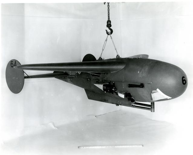 Keywords: OrdnanceWorldWarII 048.jpg The Pelican was developed concurrently with the Bat by NBS the Navy Bureau of Ordnance and the MIT Radiation Laboratory The Pelican is shown with instrumentation for field testing Directly beneath the wing shown in the photo was mounted a 16mm Bell and Howell Type M-4A gun sight aiming point camera Slightly forward and lower was mounted a 16mm Cine Kodak Model E camera The housing on the nose covered a panel of signal lamps indicating the application of radar controls The cameras simultaneously photographed the panel and the ground ahead of the glider National Institute of Standards and Technology National Institute of Standards and Technology PD-USGov-NIST PD-USGov SWOD Mk-7 Pelican Bell Howell
