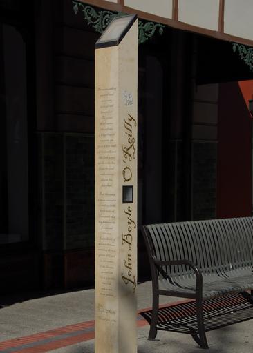 Keywords: O'Reilly installation, Fremantle.jpg Photograph of one of the five installations on the Fremantle Western Australia City Council's Writers Walk described in pdf files of their cultural and heritage trails linked from this http //www fremantletrails com au/ document This installation or 'totem' concerns John Boyle O'Reilly and a gives a selection of his writing The surrounding sea and land were very strange and beautiful The green shoal water the soft air with yellowish warmth the pure white sand of the beach and the dark green of the unbroken forest beyond made a scene almost like fairyland But there was a stern reminder of reality in the little town of Fremantle that lay between the forest and the sea It was built of wooden houses running down a gentle hill; and in the centre of the houses spread out like a gigantic starfish was a vast stone prison John Boyle O'reilly Moondyne 1880 own 2007-09-21 The Original work is by the artist Bridget Norton As public art it is presumed to also be public domain as above Fremantle Western Australia Images by Cygnis insignis Memorial walks |