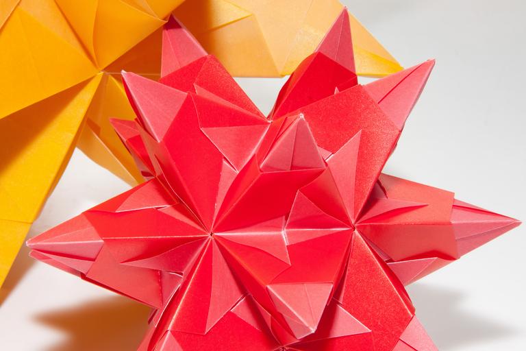 Keywords: origami art of paper folding fold 3 dimensional object star large small geometric bodies yellow red matt shiny