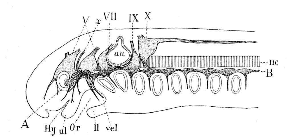 | Keywords: Origin of Vertebrates Fig 113.png Fig 113 ”Ganglia of the Cranial Nerves of an AmmocĹ“tes 4 mm in length projected on to the Median Plane After Kupffer A-B the line of epibranchial ganglia; au auditory capsule; nc notochord; Hy tube of hypophysis; Or oral cavity; u l upper lip; l l lower lip; vel septum between oral and respiratory cavities; V VII IX X cranial nerves; x nerve with four epibranchial ganglia All references in this work to AmmocĹ“tes or Petromyzon appear to refer to the European Brook Lamprey now called Lampetra planeri 1908 The Origin of Vertebrates https //archive org/details/originofvertebra1908gask Walter Holbrook Gaskell PD-old-auto-1923 1914 Origin of Vertebrates book Lampetra planeri |