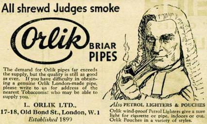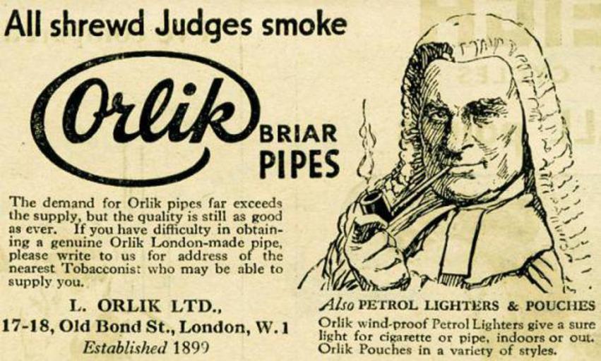 Keywords: Orlik pipes advertisement.jpg Advertisement for the Orlik pipe company showing their trademark judge figure http //pipesmagazine com/forums/topic/a-few-cool-vintage-ads Pipemagazine com 1920 Orlik Company Advertisements in the United Kingdom Smokers pipes in art Judges in art 1920 advertisements Unclear-PD-US-old-70 |