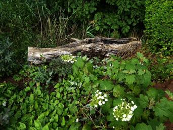 Keywords: ornamental garden old tree trunk flower bed nature green fouling plant overgrown landscape