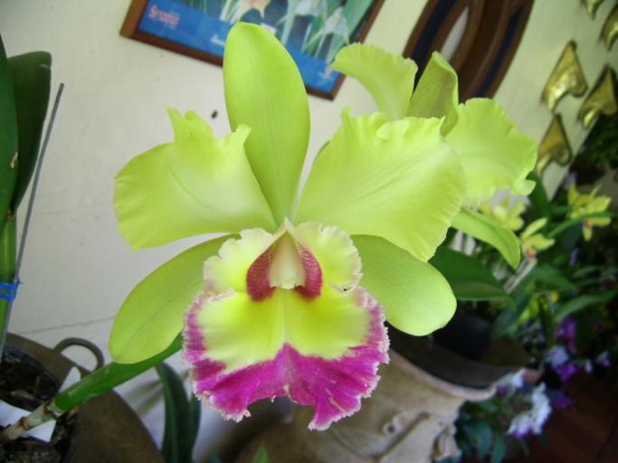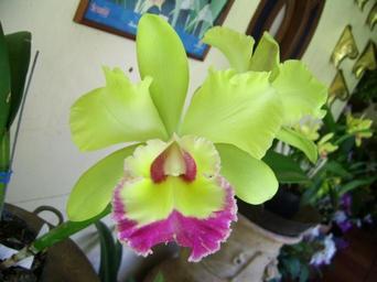 Keywords: Orquidea verde.JPG es fotografía de una orquídea verde en una maceta dentro de una casa own RoyFokker 08/09/2006 Cattleya cultivars