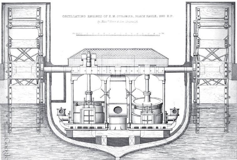 | Keywords: Oscillating paddlewheel engines of HMS Black Eagle.jpg en Transverse section through the hull of HMS Black Eagle showing arrangement of the Penn oscillating engines to the crankshaft and paddlewheels Bourne John 1868 A Treatise on the Steam Engine With its Various Applications to Mines Mills Steam Navigation Railways and Agriculture Longmans Green Co London inset between pages 304-305 Unknown probably the engine manufacturer 1868 or earlier PD-old Oscillating marine engines HMS Black Eagle |