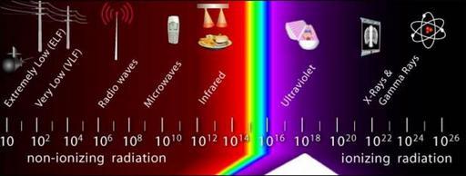 Keywords: OSHA radiation spectrum.jpg electromagnetic spectrum a chart of the different types of electromagnetic radiation ordered by increasing frequency The frequency in hertz is given on the scale at bottom The most familiar form of electromagnetic radiation is visible light center with infrared IR and ultraviolet UV light on either side The higher frequencies of EM radiation right consisting of x-rays and gamma rays are types of ionizing radiation Lower frequency radiation left consisting of light infrared IR microwave MW Radio Frequency RF and extremely low frequency ELF are types of non-ionizing radiation United States Dept of Labor - OSHA - http //iforms osha-slc gov/SLTC/radiation/index html Safety and Health Topics Radiation OSHA Safety and Health Topics 2008-09-26 Public Domain PD-USGov Electromagnetic spectrum |