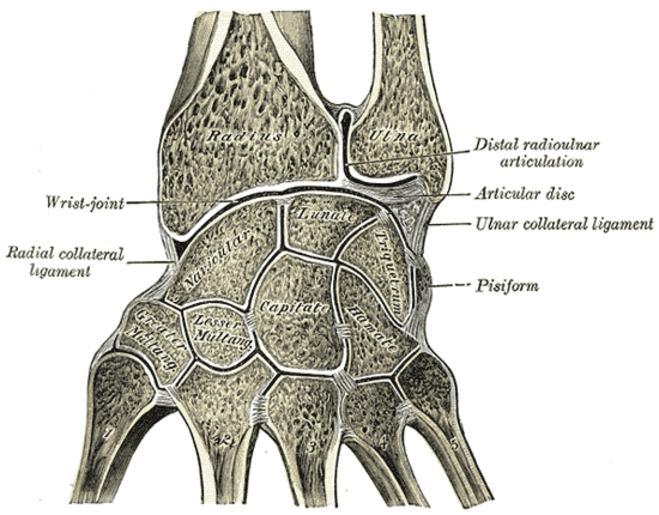 Keywords: Ospoignet.gif Vertical section through the articulations at the wrist showing the synovial cavities Other fields 1 Information field Ucfirst Plate 336 before 1858 Henry Gray Anatomy of the Human Body See Book section below 336 Creator Henry Vandyke Carter Book Gray's Anatomy PD-old-100-1923 Gray's Anatomy plates 0336 Metacarpus Carpus Trapezium bone Trapezoid bone Pisiform bone Triquetral bone Scaphoid bone Capitate bone Hamate bone Radius bone Ulna Lunate bone