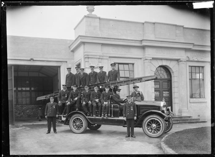 | Keywords: blackandwhite monochrome photo border black and white View of the Otahuhu Fire Brigade and fire engine in front of the Borough Council Chambers. Photograph taken by William A Price ca 1928 The Otahuhu Borough Council Chambers were built in 1926-1927. Quantity: 1 b&w original negative(s). Physical Description: Dry glass plate negative 4.5 x 6.5 inches    Otahuhu Fire Brigade outside the Borough Council Chambers. Price, William Archer, 1866-1948 :Collection of post card negatives. Ref: 1/2-000501-G. Alexander Turnbull Library, Wellington, New Zealand. natlib.govt.nz/records/22778516 View of the Otahuhu Fire Brigade and fire engine in front of the Borough Council Chambers. Photograph taken by William A Price ca 1928 The Otahuhu Borough Council Chambers were built in 1926-1927. Quantity: 1 b&w original negative(s). Physical Description: Dry glass plate negative 4.5 x 6.5 inches    Otahuhu Fire Brigade outside the Borough Council Chambers. Price, William Archer, 1866-1948 :Collection of post card negatives. Ref: 1/2-000501-G. Alexander Turnbull Library, Wellington, New Zealand. natlib.govt.nz/records/22778516  |