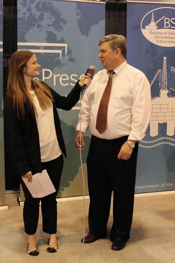 Keywords: bsee bureau safety environmental enforcement offshore energy ocean gulf arctic pacific oil gas ocs platform rig production spill preparedness planning regulator exploration regulation drill inspection permit research testing stewardship engineering sems stem petroleum tap response standards decommissioning suit BSEE Gulf of Mexico Regional Director Lars Herbst speaks to a reporter from the International Association of Drilling Contractors at the 2016 OTC BSEE booth BSEE Gulf of Mexico Regional Director Lars Herbst speaks to a reporter from the International Association of Drilling Contractors at the 2016 OTC BSEE booth |