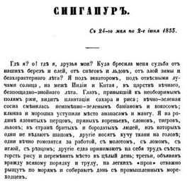 | Keywords: Otechestvennye zapiski 1856 3.jpg ru Жу нал Отечественные записки 1856 3 Оче к И А Гонча ова Сингапу 1856 https //books google ru/books id 3VMFAAAAQAAJ pg PA1 v onepage q f false И А Гонча ов Отечественные записки other versions Custom license marker 2016 07 13 PD-old Ivan Goncharov |