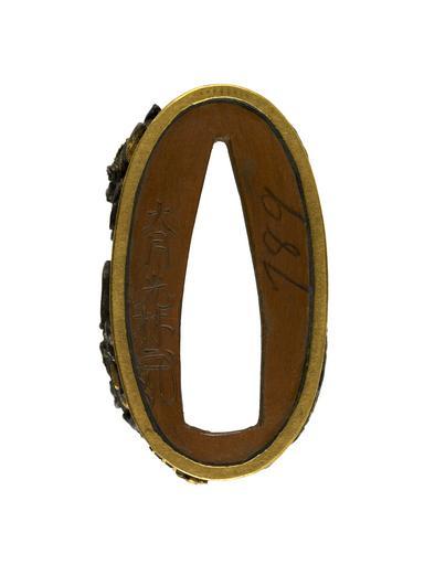 | Keywords: Ôtsuki Mitsushige - Fuchi with Benkei and Yoshitsune Fighting - Walters 511052 - Mark A.jpg This is scene is the legendary fight between Benkei and Yoshitsune also known as Ushiwakamaru on the Gojô bridge in Kyoto Benkei had unusual strength but Yoshitsune had been trained in fighting by mythical mountain demons called tengu Benkei was amazed at Yoshitsune's great skill and became his follower This is part of a set with Walters 51 1053 late 17th-early 18th century Edo shakudo gold copper cm 3 7 l accession number 51 1052 8220 William T / Henry Walters Collection Baltimore date and mode of acquisition unknown Walters Art Museum Henry Walters Acquired by William T or Henry Walters Signature Ôtsuki Korin; Number In pencil 789 place of origin Kyoto Japan Walters Art Museum license Media contributed by the Walters Art Museum needs category review Fuchi showing Yoshitsune and Benkei's duel on the Gojo-bashi by Ôtsuki Mitsushige 789 number |