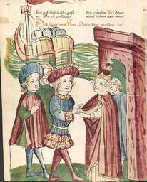 Keywords: Otto IV. und Papst Innocenz III. reichen sich vor den ankommenden Schiffen Friedrichs II. die Hände.jpg   Otto IV und Papst Innocenz III reichen sich vor den ankommenden Schiffen Friedrichs II die Hände Werkstatt des Diebold Lauber unbekannter Künstler Zeichnung ganzseitig ungerahmt Feder koloriert Wasserfarbe Deckfarbe Kaiser Otto IV der sich Begleitung zweier Höflinge befindet und Papst Innozenz III der in Begleitung eines Kardinals unter einem Stadttor steht reichen sich beide Hände Die Darstellung des Vordergrundes dürfte sich somit auf den Romzug Ottos IV 1209 beziehen Im Hintergrund nähert sich aber bereits ein Schiff mit den Truppen Friedrichs II der erst 1212 gegen Otto IV aufbrach Die Hände des Papstes und der Bildmittelgrund blieben unvollendet PD-Art Otto IV Holy Roman Emperor Universitätsbibliothek Heidelberg Cod Pal germ 149 Frederick II Holy Roman Emperor Innocentius III in miniatures Diebold Lauber Artworks missing infobox template
