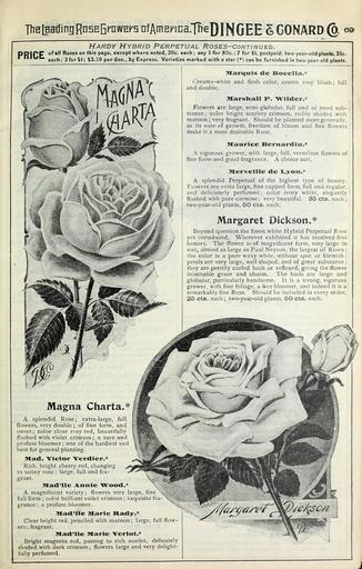 | Keywords: Our new guide to rose culture (16570080481).jpg ThElBafliniRnsEErawEFSDfAinEi'iGa llieDINGEE SCONARD 0 e <br> Hardy Hybrid Perpetual Roses-continued <br> PRIPF of ill Roses on this page except where noted 20c each ; any 3 for 50c ; 7 for 1 postpaid; two-year-old plants 35c <br> rniUti ggjjj 3for 1; 3 50 perdoz by Express Varieties marked with a star can be furnished in two-year-old plants <br> Marquis de Bocella <br> Creamy-white and flesh color centre rosy blush <br> full <br> and double <br> Marsball I» W ilder <br> Flowers are large semi- globular full and of q-ood sub- i <br> stance; color bright scarlety crimson richly shaded with ' <br> maroon ; very fragrant Should be planted more generally <br> as its ease of growth freedom of bloom and fine flowers ' <br> make it a most desirable Rose <br> maurice Beriiardiu <br> A vigorous grower with large full vermilion flowers of <br> fine form- and good fragrance A choice sort <br> Merveille de I yoii <br> A splendid Perpetual of the highest type of beauty <br> Flowers are extra large fine cupped form full and regular – <br> and deliciously perfumed ; color ivory white elegantly ' <br> flushed with pure carmine ; very beautiful 35 Cts each ; <br> two-year-old plants 50 cts each <br> Margaret Dickson <br> Â¥ <br> Beyond question the finest white Hybrid Perpetual Rose <br> yet introduced Wherever exhibited it has received first <br> honors The flower is of magnificent form very large in <br> size almost as large as Paul Neyron the largest of Roses ; <br> the color is a pure waxy white without spot or blemish ; <br> petals are very large well shaped and of great substance ; <br> they are prettily curled back or reflexed giving the flower <br> inimitable grace and charm The buds are large and <br> globular particularly handsome It is a strong vigorous <br> grower with fine foliage a f ee bloomer and indeed it is a <br> remarkably fine Rose Should be included in every order <br> 25 Cts each ; two-year-old plants 60 cts each <br> Magna Charta f <br> A splendid Rose; extra-large full <br> flowers very double; of fine form and <br> sweet; color clear rosy red beautifully <br> flushed with violet crimson ; a sure and <br> profuse bloomer ; one of the hardiest and <br> best for general planting <br> Mad Victor Verdier <br> Rich bright cherry red changing <br> to satiny rose ; large full and fra- <br> grant <br> Madaie Annie iVood <br> A magnificent variety; flowers very large fine <br> full form ; color brilliant violet crimson ; exquisite fra <br> grance ; a profuse bloomer <br> Tllad'lle Marie Rady <br> Clear bright red penciled with maroon; large full flow- <br> ers ; fragrant <br> Mad lle Marie Verlot <br> Bright magenta red passing to rich scarlet delicately <br> shaded with dark crimson ; flowers large and very delight- <br> fully perfumed 43875656 149643 77861 Page 69 Text http //www biodiversitylibrary org/page/43875656 1891 10 5962/bhl title 77861 Dingee Conard Co ; Henry G Gilbert Nursery and Seed Trade Catalog Collection Biodiversity Heritage Library Our new guide to rose culture 1900 Garden Stories Catalogs Dingee Conard Co Flowers Nurseries Horticulture Nursery stock Roses Seeds Trade catalogs U S Department of Agriculture National Agricultural Library bhl page 43875656 dc identifier http //biodiversitylibrary org/page/43875656 bhlGardenStories BHLinbloom dingee conard co nurseries horticulture u s department of agriculture national agricultural library bhlgardenstories bhlinbloom Information field Flickr posted date ISOdate 2015-02-18 Check categories 2015 August 24 CC-BY-2 0 BioDivLibrary https //flickr com/photos/61021753 N02/16570080481 2015-08-24 02 53 37 cc-by-2 0 PD-old-70-1923 Our new guide to rose culture 1891 Photos uploaded from Flickr by Fæ using a script |