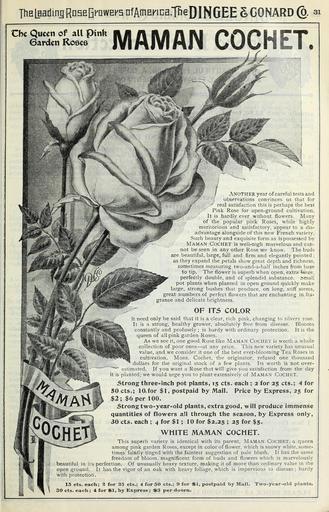 | Keywords: Our new guide to rose culture (15951479463).jpg ThELeadinBRnHEnmwBFBnfAmBnnH TfieDINGEE 6G0NARD Q 31 <br> Cbe Queen of all pink <br> 6arden Roses <br> MAMAN COCHET <br> Another year of carefal tests and <br> / observations convinces us that for <br> real satisfaction this is perhaps the best <br> Pink Rose for open-ground cultivation <br> It is hardly ever without flowers Many <br> of the popular pink Roses while highly <br> meritorious and satisfactory appear to a dis- <br> advantage alongside of this new French variety <br> Such beauty and exquisite form as is possessed by <br> Maman Cochet is well-nigh marvelous and can- <br> not be seen in any other Rose we know The buds <br> are beautiful large full and firm and elegantly pointed ; <br> as they expand the petals show great depth and richness <br> sometimes measuring two-and-a-half inches from base <br> to tip The flower is superb when open extra laree <br> perfectly double and of splendid substance small <br> pot plants when planted in open ground quickly make <br> large strong bushes that produce on long stiff stems <br> great numbers of perfect flowers that are enchanting in fra- <br> grance and delicate brightness <br> OF ITS COLOR <br> it need only be said that it is a clear rich pink changing to silvery rose <br> It is a strong healthy grower absolutely free from disease Blooms <br> constantly and profusely ; is hardy with ordmary protection It is the <br> queen of all pink garden Roses <br> As we see it one good Rose like Maman Cochet is worth a whole <br> collection of poor ones ” at any price This new variety has unusual <br> value and we consider it one of the best ever-blooming Tea Roses in <br> cultivation Mons Cochet the originator refused one thousand <br> dollars for the original stock of a few plants Its worth is not over- <br> estimated If you want a Rose that will give you satisfaction from the day <br> it is planted we would urge you to plant extensively of Mamax Cochet <br> Strong three inch pot plants 15 cts each ; 2 for 25 cts ; 4 for <br> 50 cts ; 10 for 1 postpaid by Mail Price by Express 25 for <br> 2; 6 per 100 <br> Strong two year old plants extra good will produce immense <br> quantities of flowers all through the season by Express only <br> 30 cts each ; 4 for 1 ; 10 for 2 25 ; 25 for 5 <br> WHITE MAMAN COCHET <br> This superb variety is identical with its parent MamaN Cochet a queen <br> among pink garden Roses except in color of flower which is snowy white some- <br> times faintly tinged with the faintest suggestion of pale blush It has the same <br> freedom of bloom magnificent form of buds and flowers which is marvelously <br> beautiful in i s perfection Of unusually heavy texture making it of more than ordinary value in the <br> open ground It has the vigor of an oak with heavy foliage which is impervious to disease ; hardy <br> with protection <br> 15 cts each; 3 for 35 cts ; 4 for 50 cts ; 9 for SI postpaid by Mail <br> \ 30 cts eacli ; 4 for 1 by Express ; 3 per dozen <br> Two-year-old plants 43875618 149643 77861 Page 31 Text http //www biodiversitylibrary org/page/43875618 1891 10 5962/bhl title 77861 Dingee Conard Co ; Henry G Gilbert Nursery and Seed Trade Catalog Collection Biodiversity Heritage Library Our new guide to rose culture 1900 Garden Stories Catalogs Dingee Conard Co Flowers Nurseries Horticulture Nursery stock Roses Seeds Trade catalogs U S Department of Agriculture National Agricultural Library bhl page 43875618 dc identifier http //biodiversitylibrary org/page/43875618 bhlGardenStories Maman Cochet BHLinbloom dingee conard co nurseries horticulture u s department of agriculture national agricultural library bhlgardenstories maman cochet bhlinbloom Information field Flickr posted date ISOdate 2015-02-18 Check categories 2015 August 24 CC-BY-2 0 BioDivLibrary https //flickr com/photos/61021753 N02/15951479463 2015-08-24 03 52 38 cc-by-2 0 PD-old-70-1923 Our new guide to rose culture 1891 Photos uploaded from Flickr by Fæ using a script |
