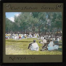 Keywords: Out-Station Service, Kenya, ca.1905-ca.1940 (imp-cswc-GB-237-CSWC47-LS7-047).jpg en <br> Out-Station Service Kenya ca 1905-ca 1940 Out-station Service Photograph of a large group gathered for an out-station service at one of the mission hospitals in Kenya The group is gathered sitting on the ground in an opening surrounded by trees ; This belongs to a series of Church of Scotland Foreign Missions Committee lantern slides relating to the Kikuyu Mission in Kenya which was set up by Church of Scotland missionaries Hospitals were established by Scottish missionaries in Kikuyu in 1908 in Tumutumu in 1909 and in Chogoria in 1922 The missionaries also introduced the Presbyterian Church to the area The Kikuyu are Kenyaas most populous ethnic group Photographer Unknown Filename imp-cswc-GB-237-CSWC47-LS7-047 tif Coverage date 1905/1940 Part of collection International Mission Photography Archive ca 1860-ca 1960 Type images Part of subcollection Photographs from the Centre for the Study of World Christianity University of Edinburgh U K ca 1900-ca 1940s Repository name Centre for the Study of World Christianity Archival file impaunpub_Volume7/1653 url Repository address The University of Edinburgh School of Divinity New College Mound Place Edinburgh EH1 2LX United Kingdom Geographic subject country Kenya Format aacr2 1 lantern slide 8 x 8 cm Geographic subject continent Africa Rights Contact the repository for details Part of series Kenya Mission LS7 Repository email divinity-CSWC ed ac uk Subject lcsh Keyword Medical care; Hospital patients Date created 1905/1940 Publisher of the digital version University of Southern California Libraries Subject aat genre exterior views Format aat lantern slides Legacy record ID impa-m68760 Access conditions http //www ed ac uk/schools-departments/divinity/research/centres/world-christianity/collections-resources File GB 237 CSWC47/LS7/47 1905/1940 author http //digitallibrary usc edu/cdm/ref/collection/p15799coll123/id/64773 PD-old-70-1923 Magic lantern images Images from USC Digital Library uploaded by Fæ International Mission Photography Archive ca 1860-ca 1960 |
