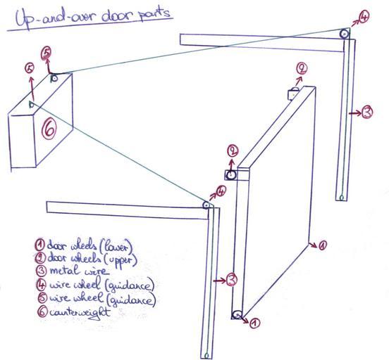 Keywords: Overhead door components.JPG en A schematic of the construction of an overhead door Note that the 2 rails are completely seperate the door wheels cannot move from rail 1 to rail 2 The upper wheels connect to the horizontal rails and the lower ones connect to the vertical rails Also not that in this design the counterweight connects to 2 seperate metal wires wich are each connected to the lower wheels not the upper wheels The schematic was made by simply analysing KVDP's current home garage door and drawing it over own KVDP 2010-03-22 Doors Type of gate |