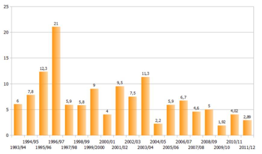 | Keywords: Overwintering area of Danaus plexippus in Mexico 1993-2011 orange.png en Size of overwintering area in hectar of Monarch Butterfly Danaus plexippus in Mexico 1993/94-2011/12 Based on data of Eduardo Rendón-Salinas and colleagues of World Wildlife Fund - Mexico and the Reserva de la Biosfera Marisposa Monarca RBMM de Größe der à berwinterungsgebiete in Hektar des Monarchfalter Danaus plexippus in Mexiko 1993/94-2011/12 Grundlage sind Daten von Eduardo Rendón-Salinas und seinen Kollegen vom World Wildlife Fund - Mexiko und dem Reserva de la Biosfera Marisposa Monarca RBMM see also File Overwintering area of Danaus plexippus in Mexico 1993-2005 orange png see also File Overwintering area of Danaus plexippus in Mexico 1993-2009 orange png Made with http //www libreoffice org/ Libre Office Calc x22px x22px own 2012-10-19 Harald Suepfle Data used with Libre Office calc wikitable - Jahr Hektar link - 1993/94 6 http //assets panda org/downloads/danaids2007 pdf - 1994/95 7 8 - 1995/96 12 3 - 1996/97 21 - 1997/98 5 9 - 1998/99 5 8 - 1999/2000 9 - 2000/01 4 - 2001/02 9 5 - 2002/03 7 5 - 2003/04 11 3 - 2004/05 2 2 http //www monarchwatch org/update/2005/0221_Sci_Adv_Rpt_11 pdf - 2005/06 5 9 - 2006/07 6 7 - 2007/08 4 6 - 2008/09 5 - 2009/10 1 92 http //www wwf org mx/wwfmex/archivos/bm/110214-incrementa-superficie-ocupada-mariposa-monarca php - 2010/11 4 02 http //www wwf org mx/wwfmex/archivos/bm/110214-incrementa-superficie-ocupada-mariposa-monarca php - 2011/12 2 89 http //www ouramazingplanet com/2624-monarch-butterfly-numbers-hit html PD-ineligible Cc-zero Danaus plexippus information graphics |