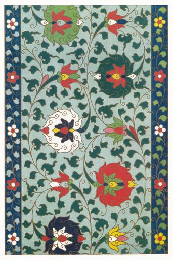 Keywords: Owen Jones - Examples of Chinese Ornament - 1867 - plate 011.png 010 XI 11 012 The same principles which are exhibited in Plate II are to be seen in this specimen from a Bowl in cloisonné enamel The large flowers are arranged in triangles crossed by smaller flowers in the opposite direction and all connected by a continuous stem throwing off leaves and stalks to fill up the ground; all geometrically arranged and yet not in a manner so apparent as to interfere with the freedom of the composition The system of triangulation is still further kept up in the colouring On the left the purple flower is the apex of a triangle with two red flowers for a base the left one not being contained on the plate In the same way on the right of the plate the light-green flower is the apex of a triangle with two dark-green flowers at the base The white flower is the centre of the composition and stands alone and yet its centre lies between two small red flowers which form the base of a triangle having a green flower for the apex Aristeas Archival version Owen Jones - Examples of Chinese Ornament - 1867 - plate 011 - 300ppi jpg PNG PD-old-100-1923 Cloisonné of China Metal bowls Floral patterns Floral designs in China |