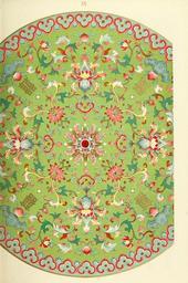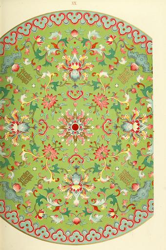 Keywords: Owen Jones - Examples of Chinese Ornament - 1867 - plate 020.png 019 XX 20 021 The same observations will apply to this plate which is taken from a painted china Dish Although all the groups are united they do not as in the finer examples we have examined proceed from one centre In this example also the pattern is indented showing that probably some mechanical means were employed to produce it; whilst on such Vases as Plates II III and V they were freely drawn by the hand without any mechanical aid PD-old-100-1923 Floral designs in China