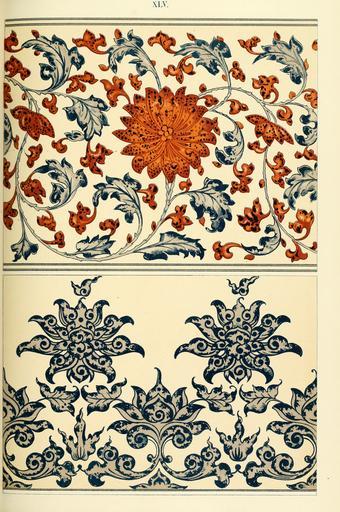 Keywords: Owen Jones - Examples of Chinese Ornament - 1867 - plate 045.png 044 XLV 45 046 On this sheet we have juxtaposed specimens of the two styles; the upper border on the continuous line principle and the lower border on the detached or fragmentary style PD-old-100-1923 Floral designs in China Floral patterns Blue and white porcelain Blue red white |