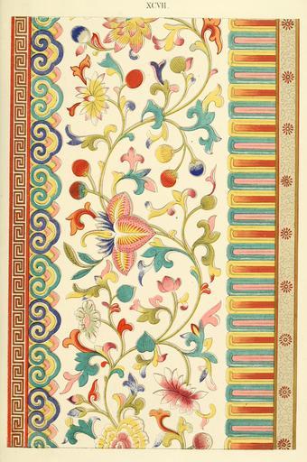 | Keywords: Owen Jones - Examples of Chinese Ornament - 1867 - plate 097.png 096 XCVII 97 098 From a painted china Bottle Composition on the continuous-stem principle The ornament in this example is in slight relief The vase was cast in a mould PD-old-100-1923 Porcelain of China Ceramic bottles Floral designs in China Greek key |