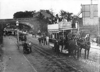 | Keywords: Oxford Road, Reading, 1893.jpg en Oxford Road Reading looking eastwards to the West Reading railway bridge 1893 The bridge carries advertising for Newbery's Furniture To the right of it is a signal-box Various carts are in the road and there is a handcart with four large open baskets on it Horse-tram No 2 has stopped and everyone the top-hatted driver and conductor the passengers and passers-by is posing for the camera this is the first day of operation for the double-decked trams following a fire at the depot The tram carries advertising for Awmack's hardware 1890-1899 photograph by Walton Adams There is a postcard version at Dyix 1243743 1893 http //readingimages epixtech co uk/extra/test3 html Reading Borough Libraries Creator Walton Adams PD-old-70 Oxford Road Reading Reading West railway station Horse trams in the United Kingdom Reading in the 1890s 1893 in England 1893 photographs Walton Adams Reading Tramways Company 1893 in rail transport in the United Kingdom |