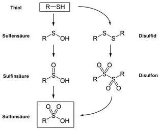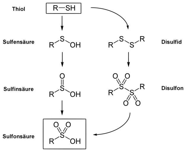 Keywords: Oxidation thiol.svg de Oxidation eines Thiols zu einer Sulfonsäure own Yikrazuul 2008-08-15 Sulfonic acids Thiols Sulfenic acids Sulfinic acids Organic disulfides Sulfones Oxidations