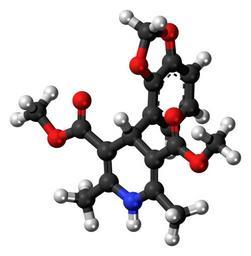 | Keywords: Oxodipine-3D-balls.png Ball-and-stick model of the oxodipine molecule a calcium channel blocker Colour code 505050 Carbon C black<br> F0F0F0 Hydrogen H white<br> F51E1E Oxygen O red<br> 3C50FA Nitrogen N blue<br> 2011-06-13 own DS Visualizer Jynto talk Space-filling version cc-zero Images by Jynto Oxodipine |