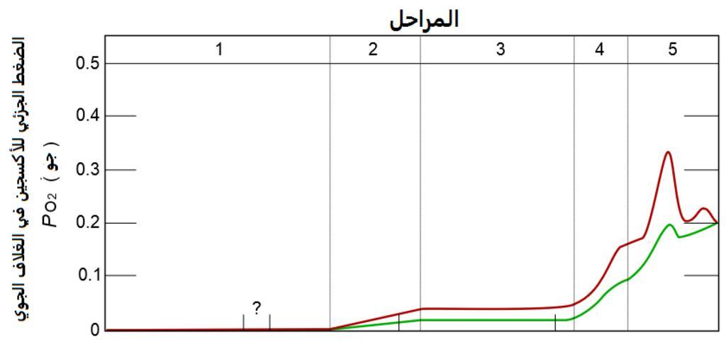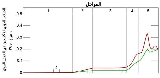 Keywords: Oxygenation-atm - Ar.png ar رسم بياني لمراحل تشكل غاز الأكسجين O2 في الغلاف الجوي للأرض، يمثل الخط الأحمر القيم التقديرية العظمى لضغط الأكسحين الجزئي في الغلاف الجو، في حين أن الأخضر يمثل القيم التقديرية الدنيا المراحل 1 لا يوجد إنتاج لغاز الأكسجين O2 في الغلاف الجوي للأرض؛ 2 إنتاج لغاز الأكسجين O2، لكن الكمية المنتجة تمتص في المحيطات؛ 3 بداية تحرر كميات من الأكسجين من المحيطات، لكنها تمتص من قبل المسطحات الأرضية، بالإضافة إلى بداية تشكل طبقة الأوزون؛ 4 5 امتلاء خزانات الأكسجين وبداية تجمع غاز الأكسجين في الغلاف الجوي 2015-08-05 https //commons wikimedia org/wiki/File Oxygenation-atm svg Heinrich D Holland other versions cc-zero Uploaded with UploadWizard Oxygen |