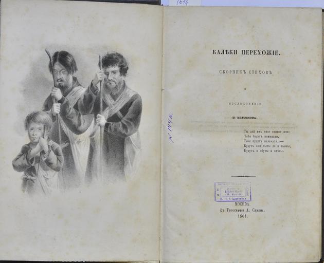 | Keywords: P. Bezsonov poems and investigation 1614.jpg  Калікі пе ехожі Ві ші та дослідження П Безсонова  осква 1861 Ф онтиспіс та титульний а куш З особистої бібліотеки І Ф анка Calico passers Bezsonov poems and investigation Moscow 1861 Frontispiece and title page From I Franko personal Library 1861 Institution Shevchenko Institute of Literature Digital Collection PD-old-70-1923 1861 books Franko Personal Library Libraries in Ukraine Collections of books in libraries in Ukraine Shevchenko Institute of Literature Uploaded with VicuñaUploader |