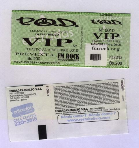 Keywords: P.o.d. La Paz, Bolivia 2011 ticket.jpg en Concert ticket for Payable On Death in La Paz Bolivia April 14 2011 es Boleto para el concierto de Payable On Death en La Paz Bolivia del 14 de abril de 2011 own Juami3000 2011-03-29 Cc-zero Christian metal music groups P O D |