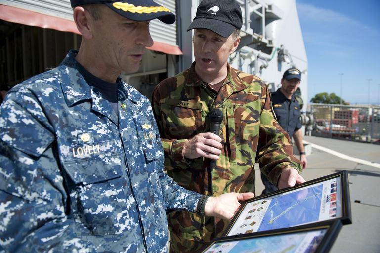 | Keywords: Pacific Partnership 130812-N-WD757-065.jpg en New Zealand Army Lt Col Ben Pitt commander of land forces gives a gift to Capt Wallace Lovely Pacific Partnership 2013 mission commander during an all-hands call on the flight deck of the Military Sealift Command dry cargo and ammunition ship USNS Mathew Perry T-AKE 9 Working at the invitation of each host nation U S Navy forces are joined by non-governmental organizations and regional partners that include Australia Canada Colombia France Japan Malaysia Singapore South Korea and New Zealand to improve maritime security conduct humanitarian assistance and strengthen disaster-response preparedness U S Navy photo by Mass Communication Specialist 2nd Class Carlos M Vazquez II/Released 2013-08-11 Petty Officer 3rd Class Carlos Vazquez II https //www dvidshub net/image/996449 130812-N-WD757-065 2013-08-15 22 42 SB PD-USGov-Military-Navy Pacific Partnership 2013 Images from DoD uploaded by Fæ |