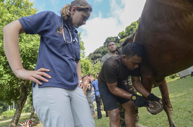 | Keywords: Pacific Partnership 2013 130620-N-GI544-018.jpg en Sharlee Haas left a volunteer with Vets Without Borders and Tonga Defense Force Lance Cpl Uhatafe K clean the hoof of Fifty-Six a Tonga Defense Force horse during a Pacific Partnership 2013 veterinary civic action project Working at the invitation of each host nation Pacific Partnership is joined by partner nations Australia Canada Colombia France Japan Malaysia Singapore South Korea and New Zealand to strengthen disaster response preparedness around the Indo-Asia-Pacific region U S Navy photo by Mass Communication Specialist 2nd Class Laurie Dexter/Released 2013-06-20 Petty Officer 2nd Class Laurie Dexter https //www dvidshub net/image/957930 130620-N-GI544-018 2013-06-20 20 54 TO PD-USGov-Military-Navy Pacific Partnership 2013 Images from DoD uploaded by Fæ |
