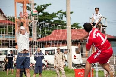 Keywords: Pacific Partnership 2014 140624-N-CF750-256.jpg en A Cambodian sailor spikes a ball against Japanese and U S service members during a Pacific Partnership 2014 sports day event in Sihanoukville Cambodia June 24 2014 Pacific Partnership is an annual deployment of forces designed to strengthen maritime and humanitarian partnerships during disaster relief operations while providing humanitarian medical dental and engineering assistance to nations of the Pacific U S Navy photo by Chief Mass Communication Specialist Greg Badger/Released Unit Defense Imagery Management Operations Center DVIDS Tags Foreign military; DIMOC; USAF; DVIDS Bulk Import 2014-06-24 Gregory Badger https //www dvidshub net/image/1418443/pacific-partnership-2014 140624-N-CF750-256 2014-06-26 00 31 SIHANOUKVILLE KH PD-USGov-Military-Navy Pacific Partnership 2014 Images from DoD uploaded by Fæ