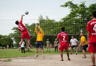 Keywords: Pacific Partnership 2014 140624-N-CF750-251.jpg en A Cambodian sailor spikes a ball against Japanese and U S Service members during a Pacific Partnership 2014 sports day event in Sihanoukville Cambodia June 24 2014 Pacific Partnership is an annual deployment of forces designed to strengthen maritime and humanitarian partnerships during disaster relief operations while providing humanitarian medical dental and engineering assistance to nations of the Pacific U S Navy photo by Chief Mass Communication Specialist Greg Badger/Released Unit Defense Imagery Management Operations Center DVIDS Tags Foreign military; DIMOC; USAF; DVIDS Bulk Import 2014-06-24 Gregory Badger https //www dvidshub net/image/1418016/pacific-partnership-2014 140624-N-CF750-251 2014-06-26 00 05 SIHANOUKVILLE KH PD-USGov-Military-Navy Pacific Partnership 2014 Images from DoD uploaded by Fæ