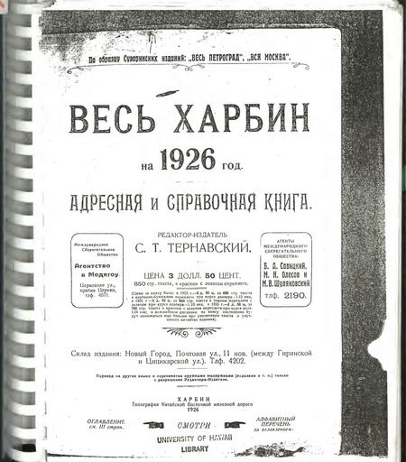 | Keywords: харбин справочная книжка справочнаякнижка адресная книга адреснаякнига 1926 text outdoor Весь Харбин на 1926 год [Текст] : адресная и справочная книга / ред.-изд. С. Т. Тернавский. - Харбин : тип. Китайской восточной ж. д, 1926. - 28 см. Ксерокоп. (библ.описание по каталогу РГБ) Источник: rucont.ru/efd/299629 Весь Харбин на 1926 год [Текст] : адресная и справочная книга / ред.-изд. С. Т. Тернавский. - Харбин : тип. Китайской восточной ж. д, 1926. - 28 см. Ксерокоп. (библ.описание по каталогу РГБ) Источник: rucont.ru/efd/299629 |