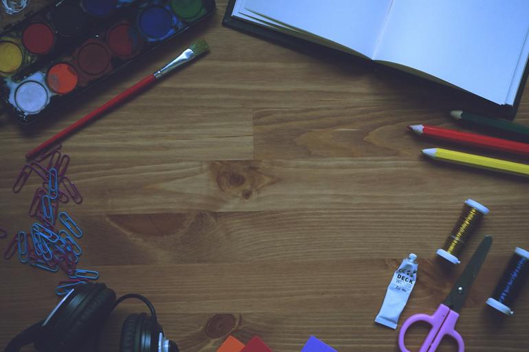 Keywords: paint notebook brush pencil foam paper painting wooden background headphones earphones drawing book pen education academic happy workspace workplace table