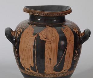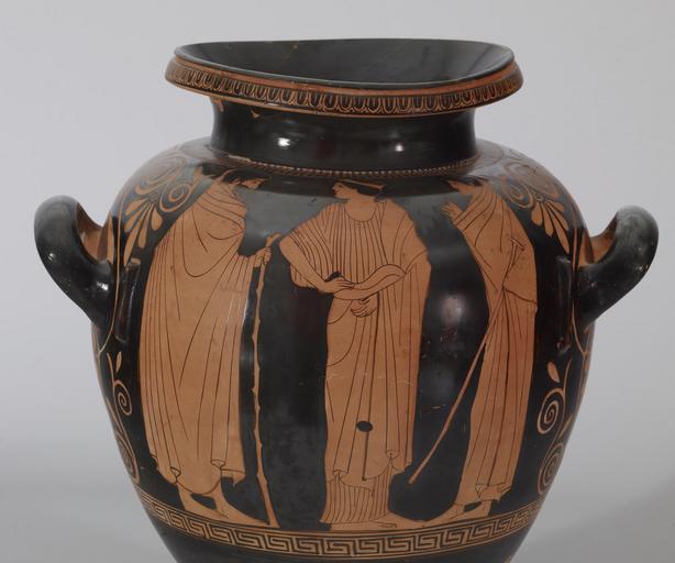 Keywords: Painter of the Florence Stamnoi - Red-figure Stamnos with Eos and Two Youths - Walters 482034 - Side B Detail A.jpg His lyre tumbling to the ground the youth Cephalus flees the amorous goddess Eos She grabs his neck while fingering her mantle in the traditional gesture of a demure bride This theme was a popular subject for red-figure vessels from the early to mid 5th century BC This stamnos wine container belongs to a class of vessels which has a low foot in the form of a ring There are seven known stamnoi of this type All have the same size and proportions and were probably fashioned by the same potter between 470 460 BC Classical terracotta cm 36 3 19 3 accession number 48 2034 35108 Robert Garrett Collection date and mode of acquisition unknown Walters Art Museum 1951 by purchase Museum purchase 1951 Translation KALOS Pandora's Box Women in Classical Greece The Walters Art Gallery Baltimore; Dallas Museum of Art Dallas; Antikenmuseum Basel und Sammlung Ludwig Basel 1995-1996 Déjà Vu Recurrence The Walters Art Museum Baltimore 2007-2008 Heroes Mortals and Myths in Ancient Greece The Walters Art Museum Baltimore; Frist Center for the Visual Arts Nashville; San Diego Museum Of Art San Diego; Alexander S Onassis Public Benefit Foundation USA New York 2009-2011 place of origin Athens Greece Walters Art Museum license Ancient Greek red-figure pottery in the Walters Art Museum Painter of the Florence Stamnoi Media contributed by the Walters Art Museum needs category review |