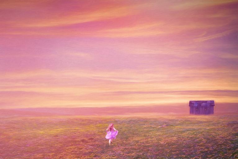 Keywords: painting image paint landscape meadow girl run home hut fantasy art