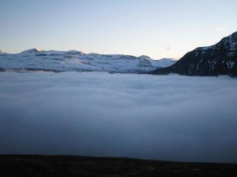 Keywords: Paisaxe con néboa1.JPG gl Paisaxe con néboa Reydarfjördur Islandia 2007 Own Lala Lugo Reyðarfjörður Oddskarð Tilted strata Hólmatindur