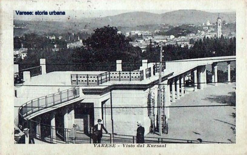 Keywords: L'elegante passaggio coperto (Kolonnade) che collegava la stazione superiore della funicolare con il Kursaal e il Palace hotel. Sullo sfondo Varese: a sinistra del campanile di San Vittore è ben visibile il cimitero monumentale sulla collina di Giubiano. palacehotel varese kursaal |