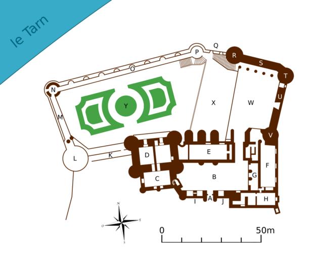 | Keywords: Palais de la Berbie.svg Palais de la Berbie à Albi <br/>A Porte fortifiée <br/>B Cour centrale <br/>C Tour St Michel <br/>D Tour Ste-Catherine ou tour majeure <br/>E Aile des Suffragants <br/>F Aile d'Amboise <br/>G Galerie de Daillon du Lude <br/>H Aula logement de Durand de Beaucaire et chapelle <br/>I Courtine de Durand de Beaucaire <br/>J Courtine et tour carrée <br/>K Rampe d'accès au jardin <br/>L Tour-éperon à bec <br/>M S et U Courtine de Bernard de Castanet <br/>N Tour de la Rivière <br/>O et Q Courtine du XIV<sup>e</sup> <br/>P Tour de Dyinisos <br/>R Tour de la bibliothèque <br/>T Tour de l'octogone <br/>V Tour d'Amboise <br/>W Terrasse <br/>X Contre-terrasse <br/>Y Jardin 2016-04-07 http //www cite-episcopale-albi fr/IMG/jpg/ill_018 jpg SyntaxTerror other versions Palais de la Berbie |