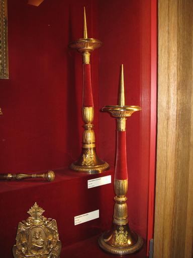 Keywords: Palais du Tau - Chandeliers d'acolyte.jpg en Ceremonial candelsticks preserved in the treasury of the palais du Tau in Reims Marne France fr Chandeliers d'acolyte conservés au trésor du palais du Tau à Reims Marne own Tangopaso 2013-12-04 Joaillerie du Palais du Tau Church candlesticks in France Silver-gilt |