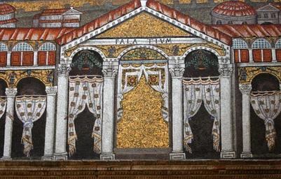Keywords: PalatiumTheodoricMosaic.jpg Basilica of Sant'Apollinare Nuovo Ravenna Emilia-Romagna Italy Detail of nave mosaic at the west end depicting Theodoric's Palace The mosaic dates from around 500 AD under Theodoric but around 560 the mosaic was censored by Catholics because the King and his court were Arians and thus considered heretics Their images were replaced with blank backgrounds and curtains A hand belonging to one of the original occupants can still be seen on some columns http //www sacred-destinations com/italy/ravenna-sant-apollinare-nuovo-photos/index htm Sacred Destinations Unknown Roman artisans original mosaic 504 modified around 560 44 4167 12 2046 PD-old-100 Palace of Theodoric in the mosaics at Sant'Apollinare Nuovo Ravenna |