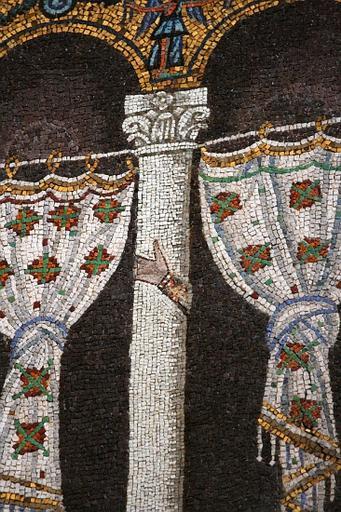 Keywords: PalatiumTheodoricMosaicDetail.jpg Basilica of Sant'Apollinare Nuovo Ravenna Emilia-Romagna Italy Detail of nave mosaic at the west end depicting Theodoric's Palace The mosaic dates from around 500 AD under Theodoric but around 560 the mosaic was censored by Catholics because the King and his court were Arians and thus considered heretics Their images were replaced with blank backgrounds and curtains A hand belonging to one of the original occupants can still be seen on some columns http //www sacred-destinations com/italy/ravenna-sant-apollinare-nuovo-photos/index htm Sacred Destinations Unknown Roman artisans original mosaic 504 modified around 560 44 4167 12 2046 PD-old-100 Palace of Theodoric in the mosaics at Sant'Apollinare Nuovo Ravenna |