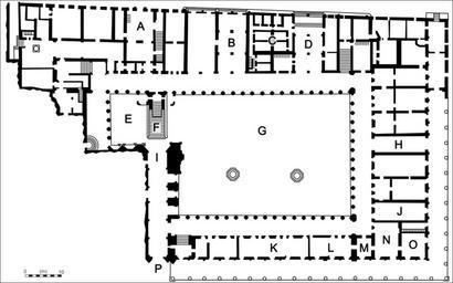 | Keywords: Palazzo Ducale Venezia Tavola 11, Francesco Zanotto-notxt.svg it Pianta del piano terreno del Palazzo Ducale di Venezia tratta da Il Palazzo Ducale di Venezia illustrato da Francesco Zanotto con incisioni Venezia 1841 A - Caffetteria B - Guardaroba C - Prigioni Pozzi D - Toilettes E - Cortiletto dei Senatori F - Scala dei Giganti G - Cortile centrale H - Entrata Porta del Frumento I - Arco Foscari J - Museo dell'Opera I locale K - Museo dell'Opera VI locale L - Museo dell'Opera V locale M - Museo dell'Opera IV locale N - Museo dell'Opera II locale 0 - Museo dell'Opera III locale P - Porta della Carta 2014-09-01 09 17 24 http //books google it/books id Gg5BAAAAcAAJ printsec frontcover hl it v onepage q f false Francesco Zanotto PD-old-100 Floorplans and facades of the Doge's Palace |