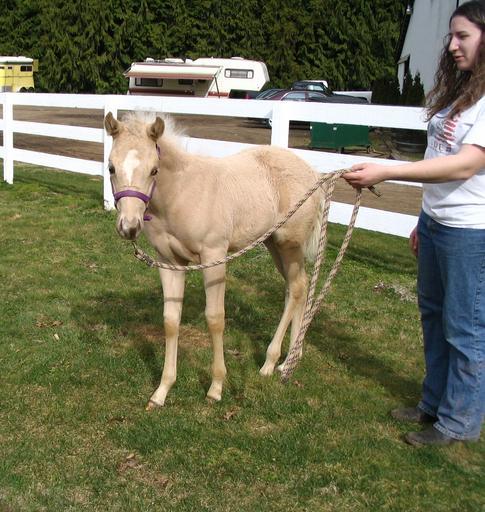 Keywords: horses palomino colt outdoor animal In this picture the colt, named Bear, is about two months old. He is accompanied by a stablehand holding his lead. CC0 waiver: To the extent possible under law, I waive all copyright and related or neighboring rights to this work. In this picture the colt, named Bear, is about two months old. He is accompanied by a stablehand holding his lead. CC0 waiver: To the extent possible under law, I waive all copyright and related or neighboring rights to this work.